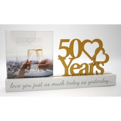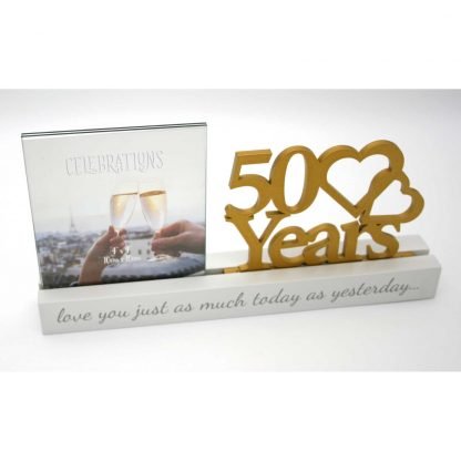 White engineered wood design topped a 4-inch square glass frame adjacent to a Golden script cut-out stating 50 years. The base proclaims “love you just as much today as yesterday…”