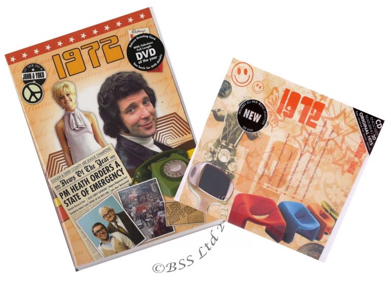 Gift the perfect time capsule on their 53rd anniversary in 2024 with our unique CD & DVD Gift Set featuring the unforgettable music and news of 1972. These bi-fold cards, filled with vintage memories, create an anniversary present like no other.